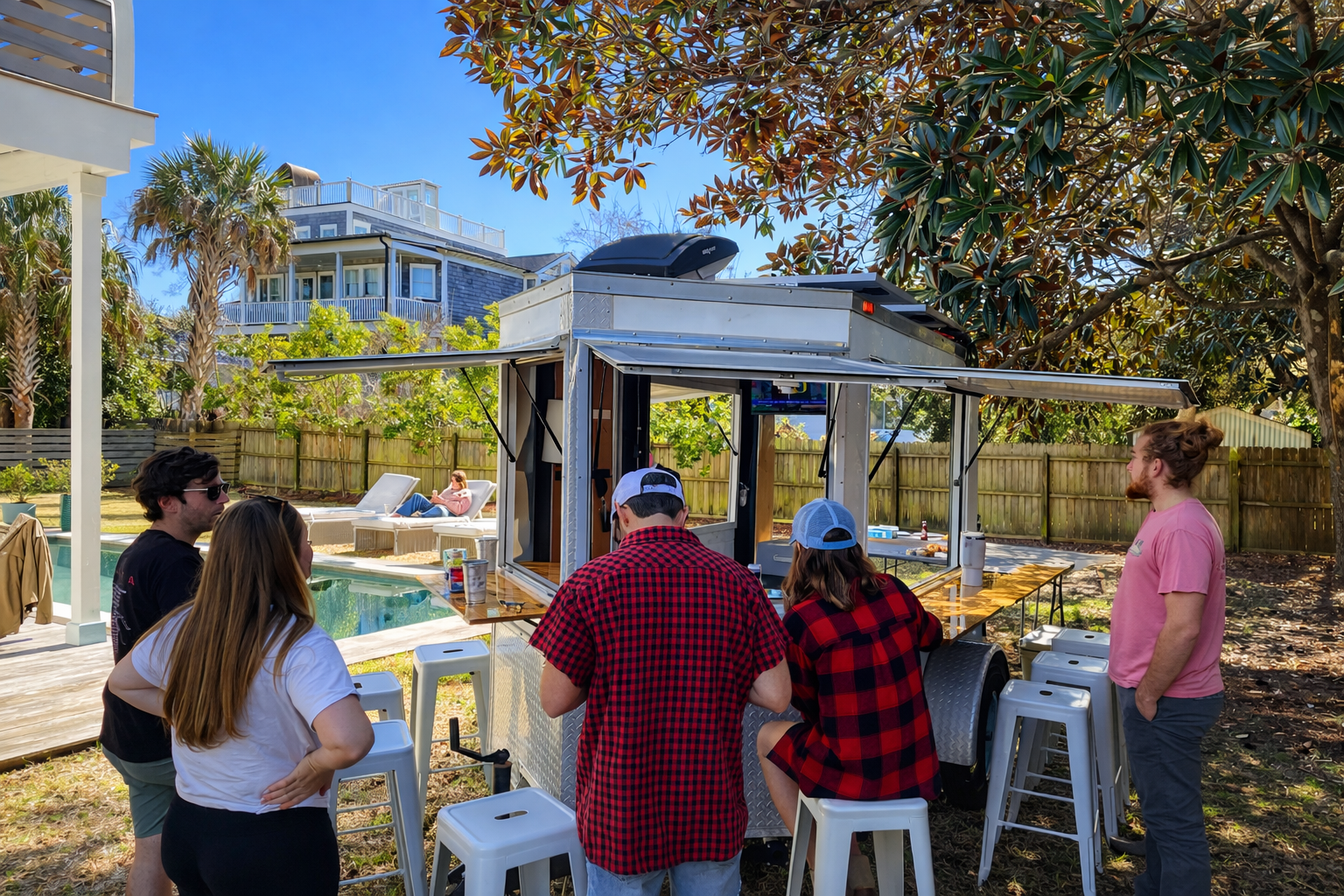 We are the first company in Charleston to offer a full backyard “Lowcountry Boil” experience out of a purposefully designed trailer. We can bring it to You by setting up in your driveway or yard. The trailer has wrap around bar seating for 12 but can accommodate more guests. We provide a shrimp ceviche appetizer and as the main a full shrimp boil!